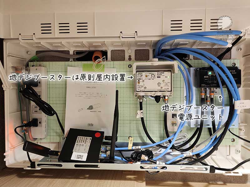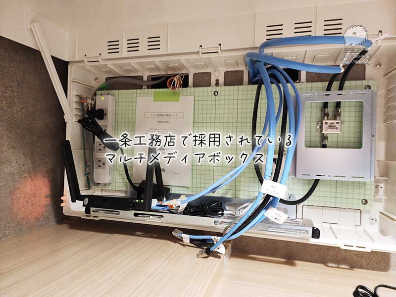ブースターをアンテナのすぐそばにつける業者も多いのですが、電波がギリギリでない限り、地デジアンテナ単体の場合は地デジブースターを屋内に設置したほうが何かとメリットがあります。一条工務店は写真のようにマルチメディアボックスがあるので、この中にブースターを収めたほうがメンテナンス性もいいですし、風雨にさらされないのは故障のリスクを多少改善することにもなります。