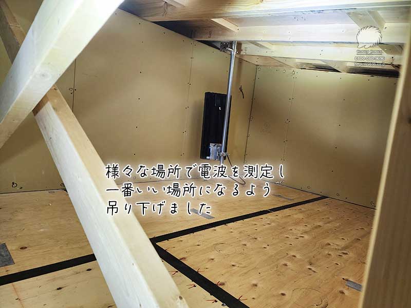ピンポイントで電波状況が上がる場所があったので、最終的にその場所に合うようにアンテナを吊り下げました。