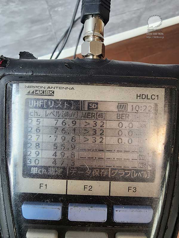 実際の計測器の画面ですが、この段階で電波が想定と大きくずれているようであれば、改めてブースターの調整を行います。