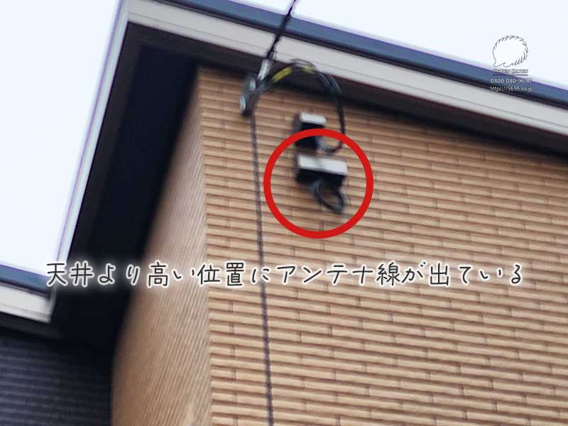 写真のように一条工務店は片流れの屋根になっていることが多いのですが、この高い場所、具体的には最上階の天井を超える高さから線が出ている場合は、屋根裏にそのままアンテナ線が引き込まれている可能性が高いです。
