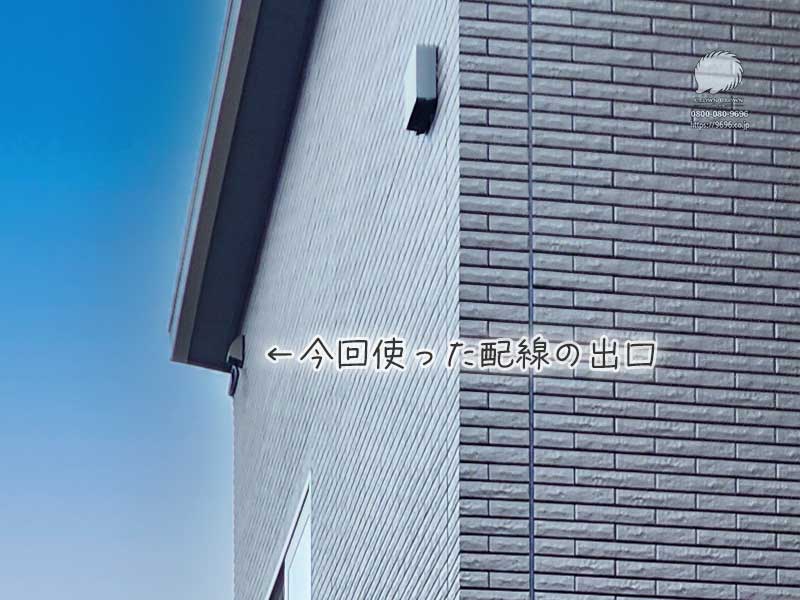 今回外に出ていた引き込み線(アンテナ線)は2か所で、建物を玄関正面から見て左奥に一つ、正面左端にもう一つありました。しかし建物の左側は土地が1mほどしかなく、高く立ち上がった壁に梯子を立てかけることができません。正面からは梯子をかけることができましたが、目立たせたくないというご要望に最適とは言えません。