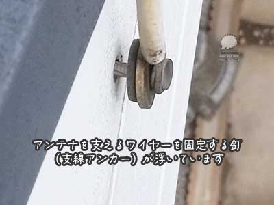 このワイヤーを固定するためのアンカー(支線アンカー)が破風などに打ち付けられていることがほとんどですが、アンテナを撤去する際にはこのアンカーをどうするか考えます。